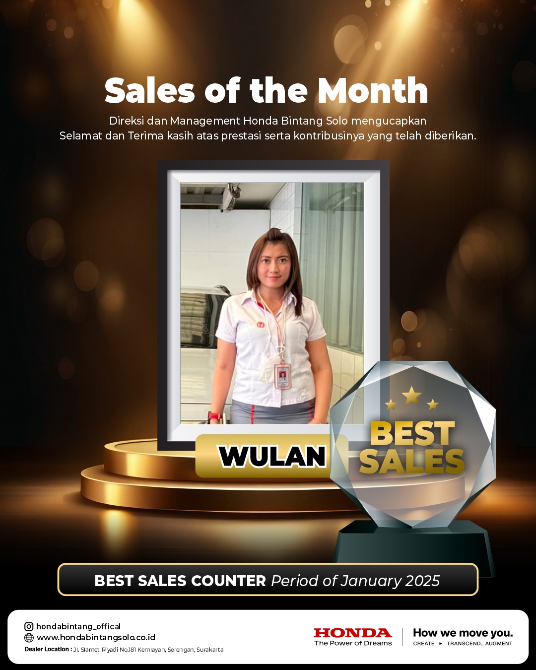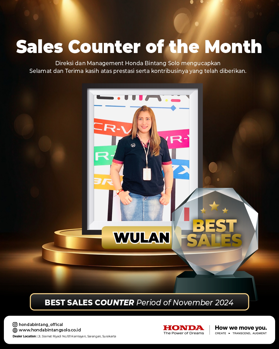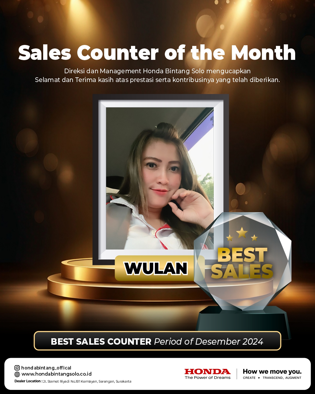 Konsulatasikan Pembelian Mobil bersama sales berpengalaman, Wulan Sales Counter Honda Bintang Solo